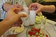 Además del raki, que se mezcla con agua en su propio vaso, se acostumbra beber con una bebida separada (agua, en este caso) pero complementaria. Para el bebedor ocasional de raki, es conveniente tomar también un vaso de agua fría.
