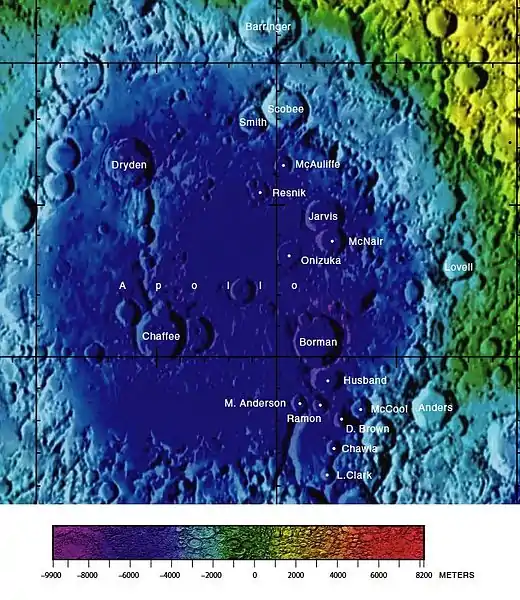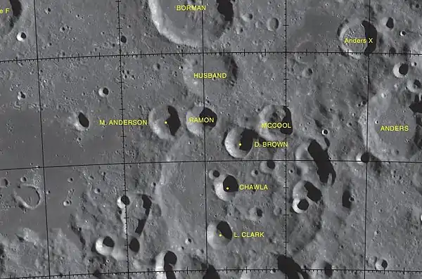 - El cráter Apolo, con la relación de los cráteres dedicados a los astronautas fallecidos en el accidente del Columbia.
