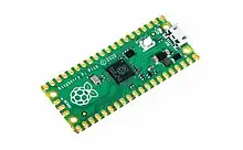 Raspberry Pi Pico. Anunciada en el 2021, es una placa pequeña y versátil construida con RP2040, un nuevo chip microcontrolador diseñado por Raspberry Pi en el Reino Unido. Este modelo está gobernada por un pequeño SoC que ha sido diseñado por los propios responsables de este proyecto. Se trata del RP2040, que cuenta con un procesador dual core ARM Cortex M0+ funcionando a 133 MHz, acompañado de 264 KB de RAM y 2 MB de almacenamiento integrado. Se han creado varios modelos: el modelo H, si tiene los pines presoldados; el modelo W, si tiene conectividad Wi-Fi y Bluetooth; y el modelo WH, si cuenta con las dos características anteriores.[63]