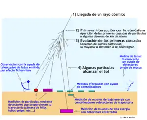 Cuando un rayo cósmico de alta energía llega a la atmósfera terrestre interactúa con átomos de ésta, choca contra los gases y libera electrones. Este proceso excita los átomos y genera nuevas partículas. Estas, a su vez, colisionan contra otras y provocan una serie de reacciones nucleares, que originan nuevas partículas que repiten el proceso en cascada. Así, puede formarse una cascada de más de 1011 nuevas partículas. Los corpúsculos integrantes de las cascadas se pueden medir con distintos tipos de detectores de partículas, generalmente basados en la ionización de la materia o en el efecto Cherenkov.