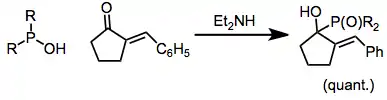 Cuando se emplean fosfonatos en presencia de cantidades catalíticas de base, pueden producirse óxidos de fosfina. Las sales de sodio de los ácidos fosfónicos históricamente han funcionado bien en este contexto, y se han utilizado bases como la amiduro de sodio.[8] Sin embargo, la inducción asimétrica y la adición directa selectiva (para compuestos de carbonilo conjugados) se pueden lograr en presencia de bases de aminas quirales:[9]