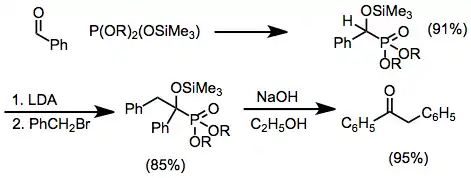 El descubrimiento y el uso de reactivos de fósforo sililado en esta reacción representaron un avance metodológico. La transferencia selectiva de grupos sililo ocurre en reactivos mixtos, y la escisión de los enlaces de silicio-oxígeno resultantes a menudo se puede lograr hidrolíticamente, proporcionando acceso a derivados de α-hidroxi. La alquilación de productos de α-siloxi proporciona una ruta conveniente para acceder de otra manera a compuestos de α-alcoxi-organofosforados. Pueden funcionar como aniones de acilo equivalentes cuando se desprotonan, y dan cetonas después de la eliminación en condiciones básicas:[10]