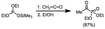 Las cetonas y los aldehídos simples experimentan fácilmente la adición de fosfitos en el carbono carbonílico. En una aplicación interesante, la adición a cetenas da productos idénticos a la reacción de Arbuzov de haluros de ácido.[11]