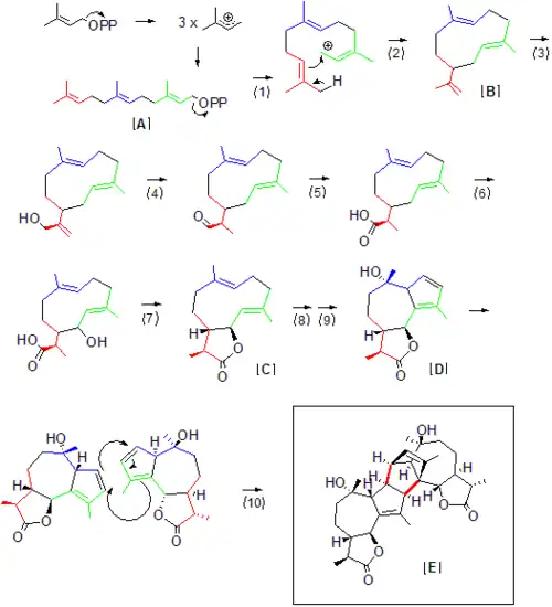Luego se postula la formación del monómero de sesquiterpeno guaianólido Absinthin [D] a partir de hidroxilación y reordenamiento de doble enlace (8,9) para preceder directamente a la dimerización a absintina[E] a través de una reacción de Diels-Alder natural,[90] que probablemente se ve facilitada por la sintasa asociada a pesar de que la reacción en sí puede ocurrir con buenos rendimientos de forma espontánea, [3] aunque más lenta que la biosíntesis típica de productos naturales.