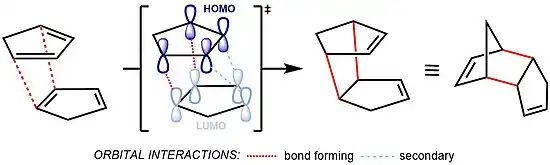 La reacción es un ejemplo de una reacción pericíclica concertada que se clasifica como una cicloadición [4 + 2] térmicamente permitida con el símbolo de Woodward-Hoffmann [π4s + π2s].[10] Se cree que ocurre a través de un solo estado de transición cíclico,[28] sin intermedios generados durante el curso de la reacción. Como tal, la reacción Diels-Alder se rige por consideraciones de simetría orbital: se clasifica como una cicloadición [π4s + π2s], lo que indica que procede a través de la interacción suprafacial / suprafacial de un sistema de electrones 4π (la estructura de dieno) con un 2π sistema de electrones (la estructura dienófila), una interacción que conduce a un estado de transición sin una barrera energética adicional impuesta por la simetría orbital y permite que la reacción de Diels-Alder tenga lugar con relativa facilidad.[29]