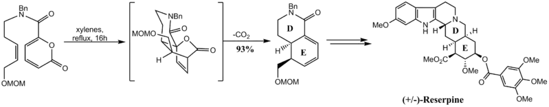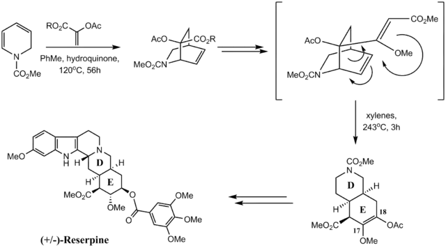 En su síntesis de reserpina en 1980,[78] Paul Wender y sus compañeros de trabajo utilizaron una reacción de Diels-Alder para establecer el marco de cis-decalina de los anillos D y E del producto natural. El Diels-Alder inicial entre el ácido 2-acetoxiacrílico y el 1,2-dihidropiridin-1-carboxilato que se muestra a continuación coloca al grupo carboxilo recién instalado en una posición para reorganizar exclusivamente los anillos fusionados en cis después de la conversión al isoquinuclideno que se muestra a continuación. La fusión cis permitió el establecimiento de la estereoquímica en C17 y C18: primero por escisión del grupo acetato en C18 para dar una cetona que pueda modular la estereoquímica del grupo metoxi C17, y luego por reducción de la cetona en C18 de Exo cara para lograr la estereoquímica del producto final.