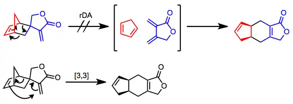 Se ha postulado que, a altas temperaturas, la isomerización de aductos endo cinéticos a productos exo más termodinámicamente estables se produjo a través de una secuencia rDA / DA. Sin embargo, dicha isomerización puede tener lugar a través de un proceso (Cope) completamente intramolecular, [3,3] -sigmatrópico. La reacción a continuación proporcionó evidencia de esto último: no se obtuvo ninguno de los isómeros "cabeza a cabeza", lo que sugiere un proceso de isomerización completamente intramolecular.[57]