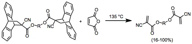 Si el objetivo es el aislamiento o la reacción de un eluyente dieno o dienófilo, se puede usar una de dos estrategias. La pirólisis instantánea con vacío de los aductos Diels-Alder sintetizados por medios independientes puede proporcionar dienófilos extremadamente reactivos y de corta duración (que luego pueden ser capturados por un dieno único).[60] Alternativamente, la reacción de rDA puede llevarse a cabo en presencia de un eliminador. El carroñero reacciona con el dieno o (más típicamente) el dienófilo para conducir el equilibrio del proceso retro-DA hacia los productos. Los cianoacrilatos altamente reactivos pueden aislarse de aductos de Diels-Alder (sintetizados independientemente) con el uso de un eliminador.[61]