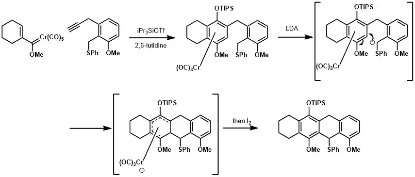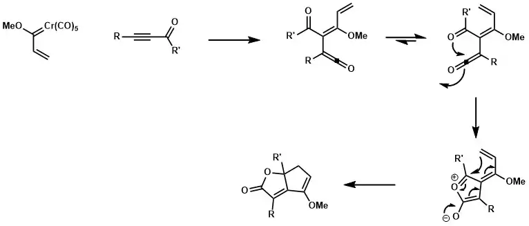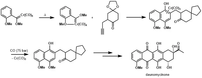 La exposición de carbeno de Fischer con cadena lateral de alquenilo a un alquino da un fenol altamente sustituido. El carbono fenólico se origina a partir del ligando de CO. La parte α, β-insaturada también podría ser de un sistema arilo rico en electrones, produciendo un sistema aromático policíclico. Esta reacción fue descubierta por primera vez por Karl Dötz y fue desarrollada extensamente por su grupo, dando así el nombre de reacción de Dötz. A veces se le llama reacción de Wuff-Dötz porque el grupo de William Wuff en la Universidad Estatal de Michigan también contribuyó ampliamente al desarrollo de esta reacción..[13]