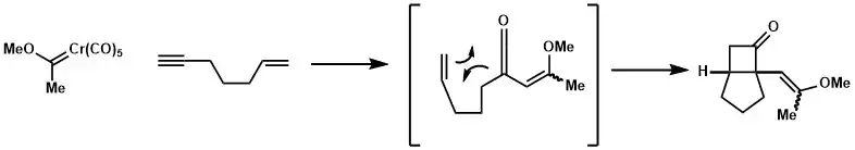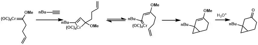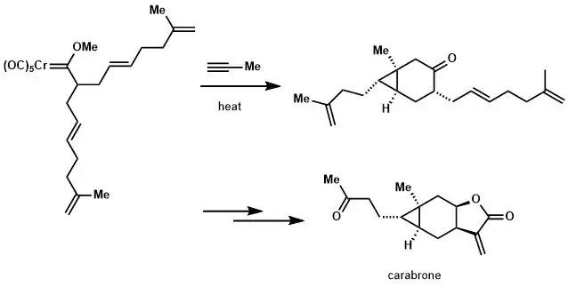 Si el resto de alqueno está presente en el carbeno de Fischer, pero no en conjugación, podría observarse ciclopropanación. La estrategia se empleó en una síntesis formal de la carabrona.[24][25]