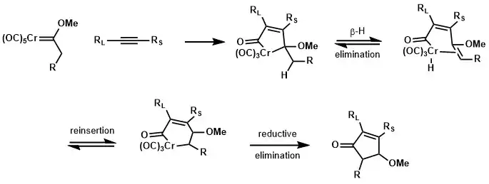 Se podrían formar carbenos de Fischer con un α-hidrógeno que podrían dar un producto de ciclopentenona similar a la reacción de Pauson-Khand. Esto se debe presumiblemente a un proceso de eliminación y reinserción de hidruro β..[23]