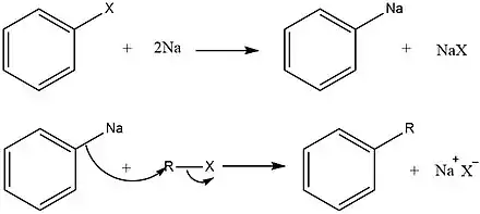 Hay dos enfoques para describir el mecanismo de la reacción de Wurtz-Fittig.[10][11] El primero implica la formación mediada por sodio de radicales alquilo y arilo. Los radicales alquilo y arilo luego se combinan para formar un compuesto aromático sustituido.