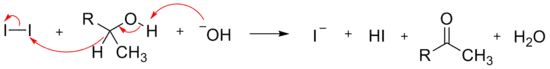 Si está presente la función CH3-CH2R-OH (esto es, un alcohol secundario, o bien etanol si R=H), es oxidado a una cetona por el hipohalito:
