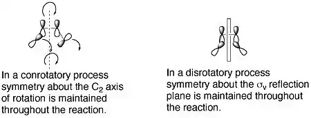 Sólo un modo disrotatorio, en el que la simetría respecto a un plano de reflexión se mantiene a través de la reacción, resultaría en un traslape de orbitales máximo en el estado de transición. Asimismo, una vez más, esto resultaría en la formación de un producto que está en un estado excitado de estabilidad comparable al estado excitado del compuesto reactante.