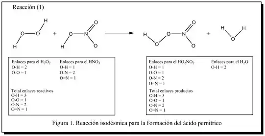 Las reacciones isodésmicas son reacciones reales o hipotéticas en la cual el número total de cada tipo de enlace es idéntico en reactivos y productos.[1] Son empleadas para realizar estimaciones termoquímicas sobre las entalpías de formación de compuestos químicos combinando datos experimentales con datos de energía obtenidos a partir de cálculos teóricos de la química cuántica. Por ejemplo para la reacción (1) hay tres enlaces O-H, tres enlaces O-N (dos O-N y uno O=N) y un enlace O-O tanto para reactivos como para productos. A continuación se muestran algunos ejemplos de reacciones isodésmicas:[2]