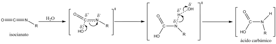 Al agregarse agua se produce la adición nucleofílica (AN) de un oxhidrilo sobre el carbono y la posterior monoprotonación del nitrógeno (reacción ácido-base) producen el intermediario de reacción ácido carbámico.[2]
