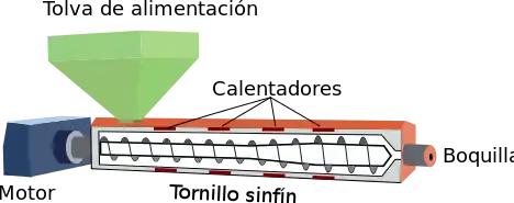Luego de formar la masa plástica en el aglutinador, se requiere un proceso de homogeneización de este material, por lo que se introduce en una máquina extrusora, la cual funde el plástico para lograr este resultado, en el que la resina alimentada del plástico o polímero es reblandecida por el aumento de temperatura generado por resistencias eléctricas y la fricción del "husillo", el cual corresponde a un elemento giratorio que se encuentra dentro de la máquina extrusora. El producto resultante sale de la máquina bajo presión por el cabezal que corresponde a una matriz metálica denominada “dado”, la cual le otorga la forma definida y sección transversal constante al producto que se encuentra en forma indefinida de masa dentro de la extrusora, obteniendo la forma de un “espagueti”, a este se le disminuye la temperatura con un baño de agua fría y de esta manera solidificar el material, para posteriormente poder fragmentarlo con un granulador formando así "pellet" plásticos, y poder ser reutilizados de manera práctica como materia prima para nuevos usos. Este proceso es un procedimiento de carácter continuo, ya que el producto en todo instante del procedimiento ocasiona un resultado invariable trabajando de manera normal. En el proceso tradicional del reciclado mecánico, la etapa de la extrusión es el procedimiento final, quedando como resultado en forma de pellet, pero actualmente los avances tecnológicos y las demandas comerciales han permitido incorporar el material plástico granulado, lavado y secado, siendo este último la etapa final en estos casos, en el que al material se le es llamado “hojuelas”, "escamas" o “flakes de PET”, incorporándolos directamente a estos nuevos procesos industriales, para la fabricación de fibras, filamentos, películas de termoformado, etc. En la actualidad ya no es necesario llegar siempre al desarrollo del plástico reciclado en forma de pellet, ya que existen dos alternativas de reciclado mecánico, y se puede llegar a este directamente por medio “hojuelas”, plásticos fragmenados, limpios sin mayor transformación.
