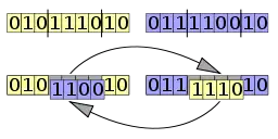 La recombinación en dos puntos requiere seleccionar dos puntos en los vectores de los organismos parentales. Todos los datos entre los dos puntos se intercambian entre los organismos parentales, creando dos organismos hijos: