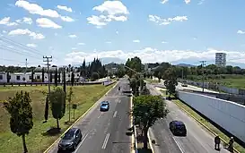 ![]() La Recta a Cholula a la altura de la UDLAP. Al fondo, la Gran Pirámide de Cholula y los volcanes Popocatépetl e Iztaccíhuatl | ||