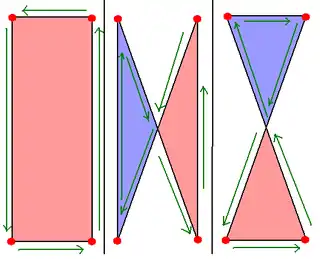 El interior de un rectángulo cruzado puede tener un densidad poligonal de ± 1 en cada triángulo, dependiendo de la orientación (en sentido de las agujas del reloj o en sentido contrario) con la que se recorrran.