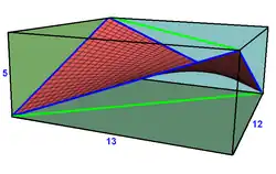 | Una silla de montar tiene 4 vértices no coplanarios (los vértices alternados de un ortoedro). Es una superficie minimal interior definida como una combinación lineal de los 4 vértices. Este ejemplo muestra 4 lados azules del rectángulo, y las dos diagonales en color verde, todos diagonales de las caras rectangulares del ortoedro. | ![]() |