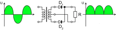 El transformador convierte la tensión alterna de entrada en otra tensión alterna del valor deseado, esta tensión es rectificada durante el primer semiciclo por el diodo D1 y durante el segundo semiciclo por el diodo D2, de forma que a la carga R le llega una tensión continua pulsante muy impura ya que no está filtrada ni estabilizada.