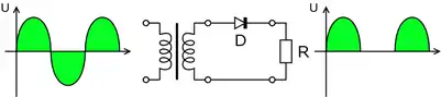 El tipo más básico de rectificador es el rectificador monofásico de media onda, constituido por un único diodo entre la fuente de alimentación alterna y la carga.