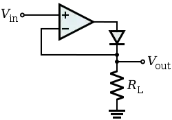 Este tipo de circuito se comporta como un diodo ideal, pues el efecto de la caída de tensión en el diodo colocado en esta configuración es casi nulo. En efecto, para que el diodo comience a conducir se requiere una caída de tensión muy pequeña, que es igual a la caída de voltaje del diodo dividida entre la ganancia de lazo abierto del amplificador operacional.[3]