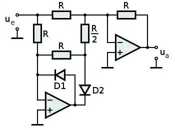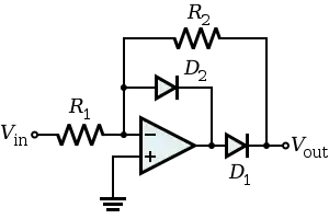 Una alternativa a la versión simple se muestra en la figura 2. En dicho caso, cuando la entrada es mayor a cero, el diodo es polarizado en inversa pero el diodo es polarizado en directa, por lo que la salida es igual a cero. Por otra parte, cuando la entrada es negativa los diodos cambian de roles y la salida posee la misma forma que la entrada pero con una amplificación de .[5] La característica de transferencia de la entrada y salida se muestra en la siguiente gráfica.[4]