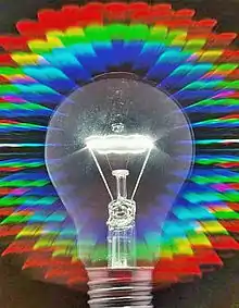 Un disco de vinilo estándar prensado, cuando se ve desde un ángulo bajo perpendicular a las ranuras, muestra un efecto similar pero menos definido al de un CD o DVD. Esto se debe al ángulo de visión (menor que el ángulo crítico de reflexión del vinilo negro) y la trayectoria de la luz que se refleja debido a que esta es modificada por los surcos, dejando un patrón de arco iris por detrás.