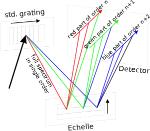 Al igual que otras redes de difracción, la red echelle está formada por una serie de ranuras (escalones) con anchos cercanos a la longitud de onda de la luz a difractar. Esta estructura permite que la luz de la longitud de onda asociada a cada ranura sea difractada hacia la posición correspondiente al orden cero cuando su incidencia sea normal al plano de difracción; mientras que los órdenes mayores serán refractados con ángulos específicos definidos por la densidad de la red para cada orden seleccionado. La separación angular entre distintos órdenes decrece monótonamente conforme aumenta el número de orden, por lo que para órdenes superiores la separación entre los mismos tiende a desaparecer, mientras que los órdenes menores suelen quedar correctamente separados.[16]