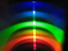 La dependencia de la longitud de onda en la ecuación de la rejilla muestra que la rejilla separa un haz incidente polícromo en sus componentes de longitud de onda constituyentes, es decir, es dispersiva. Cada longitud de onda del espectro del haz de entrada se envía en una dirección diferente, produciendo un arcoíris de colores bajo iluminación de luz blanca. Esto es visualmente similar al funcionamiento de un prisma, aunque el mecanismo es muy diferente.