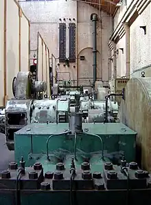 Se utilizaron muchas turbinas para accionar generadores para iluminación eléctrica. En 1887 se construyó una planta de generación de electricidad junto a la central eléctrica, que generaba corriente continua a 110 V con una potencia máxima de 800 caballos (596,6 kW) y una red de corriente alterna con una potencia máxima de 600 caballos (447,4 kW).[31] Los generadores eran impulsados por una turbina de agua alimentada por la red hidráulica.[32] La red de energía hidráulica no competía con el suministro de energía eléctrica, sino que fue concebida como un complemento de la misma, y continuó suministrando energía a muchos clientes hasta la crisis económica de la década de 1930, cuando declinó la demanda de agua a presión como fuente de energía. El último motor de agua fue dado de baja en 1958.[31]