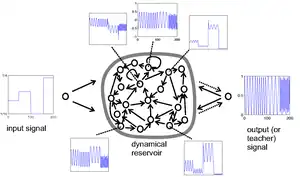 El enfoque principal de la ESN es, en primer lugar, operar una red neuronal aleatoria, grande, fija y recurrente con la señal de entrada, lo que induce una señal de respuesta no lineal en cada neurona dentro de esta red "reservoir". Y, en segundo lugar, conectar una señal de salida deseada mediante una combinación lineal entrenable de todas estas señales de respuesta.[2]