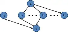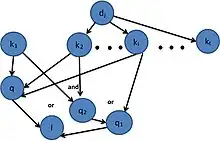 En la figura se muestra el nodo q como una consulta estándar que usa palabras claves, para la necesidad I de información del usuario. La consulta q1 es una consulta de tipo booleano para el mismo requerimiento de información. Si la red de inferencia está capacitada para modelar ambos tipos de consultas, entonces la información requerida puede ser modelada mediante un OR de q y q1. En este caso la función de ranking es calculada de la siguiente manera: