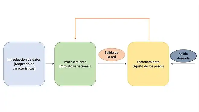 El aprendizaje automático con una red neuronal (cuántica) consta de las siguientes etapas (para más detalle, ver Red neuronal artificial):