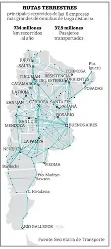 La red de rutas nacionales, con una longitud de 40 000 km, son las carreteras de jurisdicción nacional y conforman la red troncal de carreteras. La cantidad de rutas nacionales es de 118, a la cual se suman las denominadas rutas complementarias. En 2005 la red estaba compuesta por 33 235 km de rutas pavimentadas, 3577 km de ripio y 1500 de tierra.[12] incluye 10 000 km de rutas que se han otorgado en concesión por peaje a empresas privadas, que son consorcios formados principalmente por empresas constructoras.