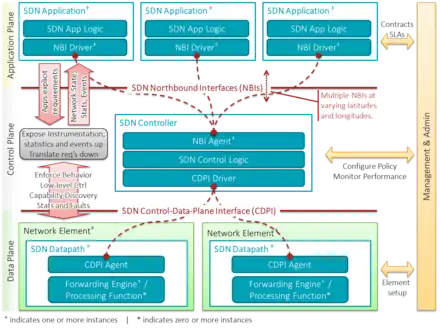 - Controlador SDN (SDN Controller): entidad lógica de control encargada de traducir las peticiones de la aplicación SDN a las rutas de datos más abajo, dando a la capa de aplicación una visión abstracta de la red mediante estadísticas y posibles eventos. Un controlador SDN consiste en uno o más NBIs, la lógica de control SDN y el CDPI driver.