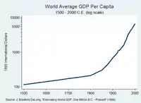 La pobreza ha sido históricamente aceptada en algunas partes del mundo como inevitable, porque las economías no industralizadas producían muy poco y esa producción también crecía muy poco, mientras que sus poblaciones aumentaban casi a la misma velocidad, haciendo la riqueza escasa.[1] Geoffrey Parker escribió que "En Antwerp y Lyon, dos de las ciudades más grandes en Europa occidental, hacia 1600, tres cuartas partes de la población total eran demasiado pobres para pagar impuestos, y por tanto probablemente necesitaban socorro en tiempo de crisis”.[2] La reducción de pobreza, o alivio de la pobreza que se ha producido en el mundo desde 1950, ha sido en gran parte debida al crecimiento económico.[3][4] Las escaseces alimentarias eran comunes antes de la tecnología agrícola moderna, y hoy lo son en sitios que carecen de esta tecnología (abonos nitrogenados, pesticidas y métodos de riego).[5][6] La revolución industrial llevó a un crecimiento económico alto, eliminando la pobreza masiva en el que es ahora considerado el mundo desarrollado.[3] El PIB mundial por persona se quintuplicó durante el siglo XX.[7] En 1820, el 75 % de la humanidad vivía con menos de un dólar al día, mientras en 2001, solo aproximadamente el 20 %.[3]