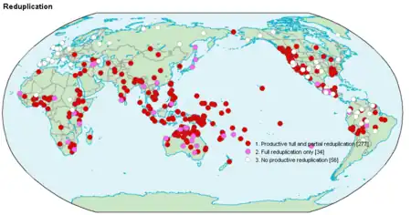 - En pápago, lengua utoazteca de México, la reduplicación parcial de primera sílaba es la forma regular de formar el plural:[2] baana 'coyote' > babaana 'coyotes'. También en guarijío y tarahumara usan regularmente la reduplicación para la formación del plural,[3] incluso otras lenguas utoaztecas que forman el plural normalmente mediante sufijos, como el náhuatl, conservan restos del antigua reduplicación parical como marca de plural: coyōtl 'coyote' > cōcoyoh 'coyotes' y conētl 'niño' > cōconēh 'niños'.[4]