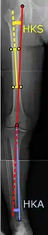 - Ángulo cadera-rodilla-tobillo (CRT),[9] que es un ángulo entre el eje mecánico femoral y el centro de la articulación del tobillo.[10] Normalmente se encuentra entre 1.0° y 1.5° de varo en adultos.[11]