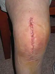 - Esta obra contiene una traducción total derivada de «Knee replacement» de Wikipedia en inglés, publicada por sus editores bajo la Licencia de documentación libre de GNU y la Licencia Creative Commons Atribución-CompartirIgual 4.0 Internacional.