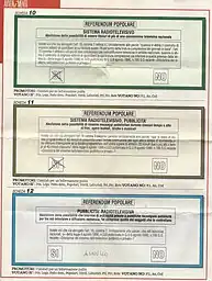 Derogación de las normas que permiten la concentración de dos cadenas de televisión. Promovido por miembros de algunas asociaciones de voluntariado, de promoción ambiental y cultural como el Mo.V.I. (Movimiento Voluntario Italiano), Legambiente, ACLI y ARCI; los primeros firmantes y presentadores fueron los secretarios nacionales o los presidentes de estas asociaciones.[7]