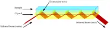 La técnica de ATR aprovecha una propiedad de la reflexión total interna llamada onda evanescente, en la que un haz de luz infrarroja incide sobre un cristal de ATR de forma que se refleje, por lo menos una vez, sobre la superficie que se encuentra en contacto con la muestra. La reflexión forma la onda evanescente que se extiende en la muestra. La profundidad de la penetración en la muestra usualmente se halla entre los 0.5 y los 2 micrómetros, con el valor exacto determinado por la longitud de onda de la luz, el ángulo de incidencia y los índices de refracción del cristal de ATR y el medio que se está analizando.[2] El número de reflexiones puede variar dependiendo del ángulo de incidencia. El haz de luz es posteriormente recolectado por el detector en el momento en el que abandona el cristal. La mayoría de los espectrómetros modernos pueden acoplarse a un equipo de ATR al montar dicho equipo en el compartimiento de muestras del espectrómetro.