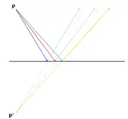 Si un rayo emitido por A se refleja en un punto P y llega a B. La longitud de la trayectoria A-P1-B seguida por este rayo es igual a la de la trayectoria A'-P1-B, siendo A’ la fuente puntual A reflejada en la superficie.