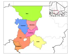 Estos círculos reagrupan 106 comunas. Bamako, capital de Malí, aunque se sitúa en el centro de la región no está ligada a esta región.