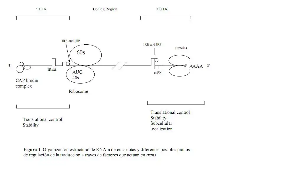 + Secuencias IRE (Iron responsive element), donde se van a unir las IRP (Iron Regulatory Protein) que son proteínas que controlan la expresión de muchos genes (ferritina, transferritina, aconitasa mitocondrial) y se unen en situación de privación de hierro e inhiben la traducción del RNAm.
