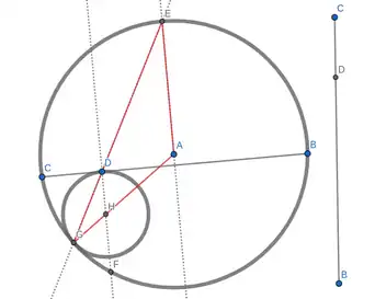 Ahora bien: una de las construcciones más sencillas con regla y compás es la de trazar una recta perpendicular a otra dada, como se ha dicho en el apartado anterior, así que se hace precisamente eso, con lo que se obtiene un «eje ».