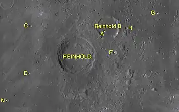 ![]() Imagen de la misión Lunar Orbiter 4 de Reinhold (centro) y Reinhold B (arriba derecha) (la mancha triangular aparece en la fotografía original) | ||