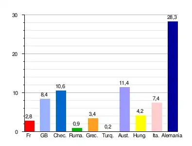 El comercio exterior no favorecía la política de alianzas yugoslava, siendo mucho mayor con sus teóricos enemigos que con sus aliados.[76][59] Las principales exportaciones del país, que decayeron enormemente durante la Gran Depresión (de ocho millardos de dinares a tres entre 1928 y 1933),[12] consistían principalmente en madera, productos agrícolas y ganaderos[77] y minerales. Frente a la posición sustancialmente estable del resto de productos en proporción de las exportaciones yugoslavas, la venta de minerales aumentó notablemente a lo largo de la década como consecuencia de la preparación para la guerra de los importadores, principalmente Alemania. La importancia de Italia, grande al comienzo del periodo, decayó rápidamente tras la participación del país en las sanciones aprobadas por la Sociedad de Naciones por el ataque italiano a Etiopía.[76]